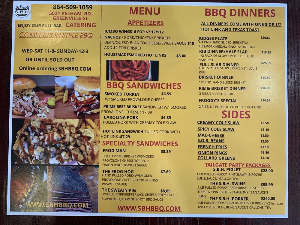 Welcome to SBH BBQ, your new favorite barbecue haven in Greenville, SC! This vibrant restaurant offers a mouthwatering menu filled with slow-smoked meats and delightful starters that will entice your taste buds. From the Fried Pickles to the hearty Tornados, each dish is crafted to impress.